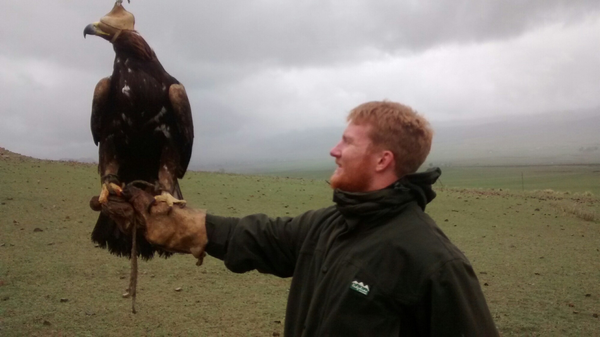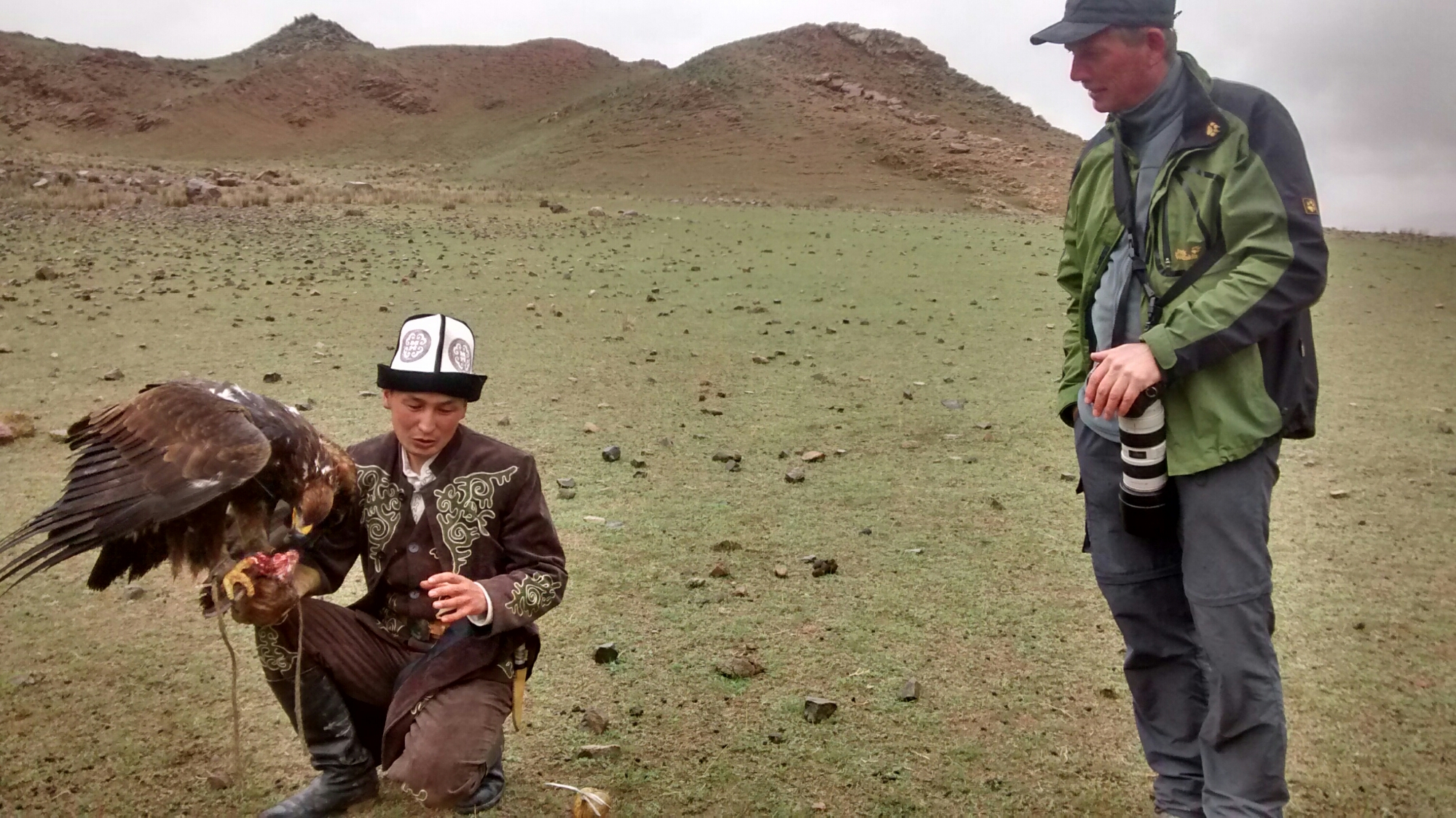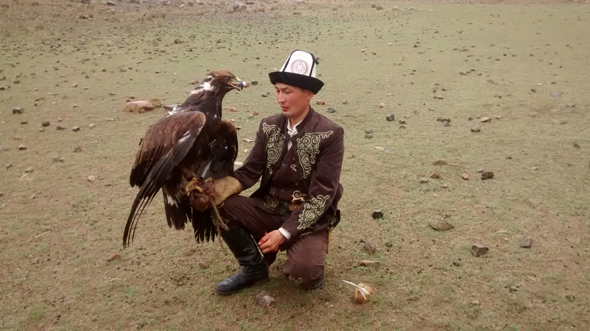 I dwelt on that statistic as I held said eagle. Huge and majestic, it was a live weight sat on my outstretched be-gloved hand. We (myself and a group of assorted Flemish bird watchers) had just paid 700 SOM (about £7) each to watch the Kyrgyz eagle hunter Ruslan fly his bird. We also got to see it hunt. For this, Ruslan’s father, himself an eagle hunter, released a live rabbit, which we watched Caracus (“black eye”) swoop on, pin, and start to eat. The rabbit died at some point, although it wasn’t immediately. It formed a fairly brutal sight, watching fur being ripped out before skin was torn and flesh rendered. This however was tempered somewhat by this tenderness shown by Ruslan. After legging it back down the hill from where he had flown the eagle from, he knelt beside it and helped the bird with its food. Knife and fingers helped the bird pry flesh from bone; he cooed softly to the bird. He talks to it as a parent talks to a child, encouraging, chiding, assisting. It was a little beacon of sweetness among the otherwise fairly bleak scene of death, drizzle, goat-spotted hills and the Flemish hired 4x4s.